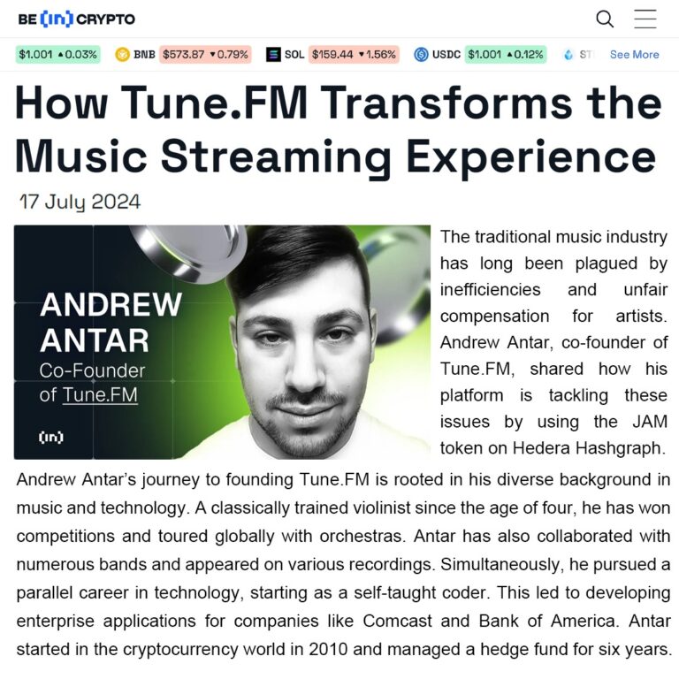 The traditional music industry has long been plagued by inefficiencies and unfair compensation for artists. Andrew Antar, co-founder of Tune.FM, shared how his platform is tackling these issues by using the JAM token on Hedera Hashgraph.